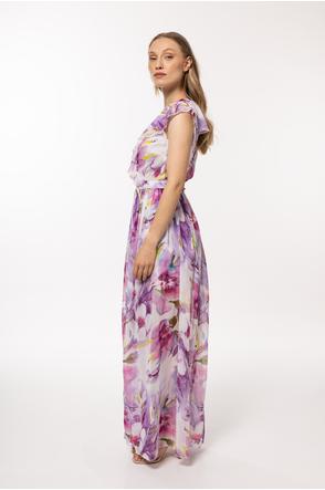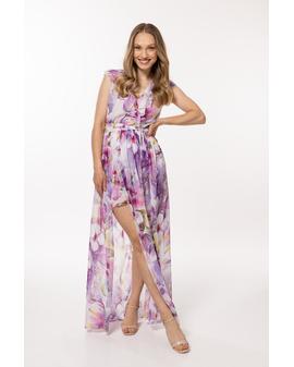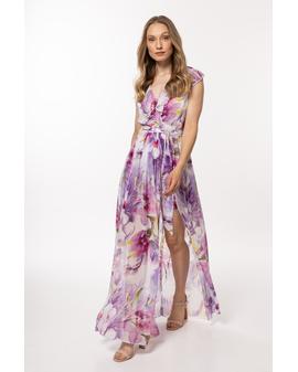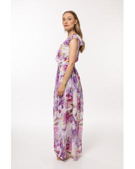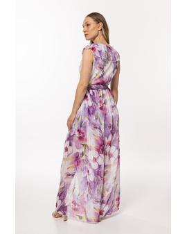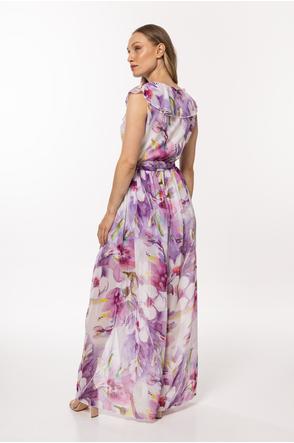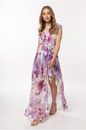 A chiffon dress with an elastic lining, tied with a belt at the waist, a wrap front top with a large, decorative frill.