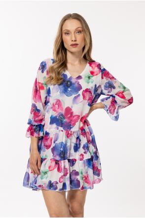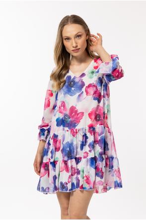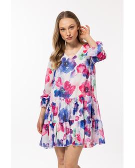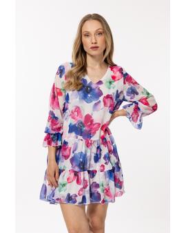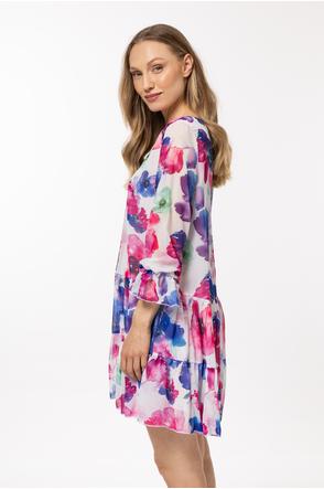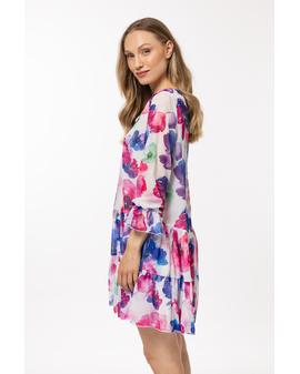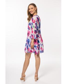 Loose-fitting dress in chiffon with an elastic lining, two frills at the hem and small ruffles at the sleeves.
