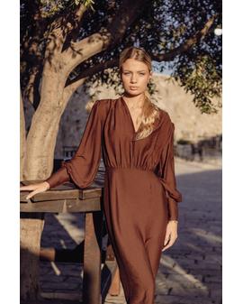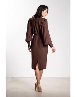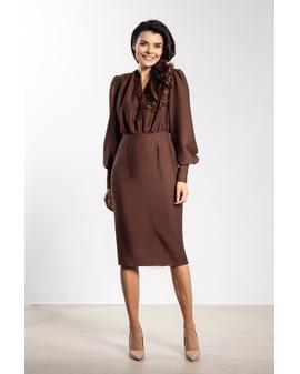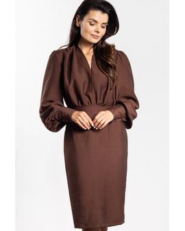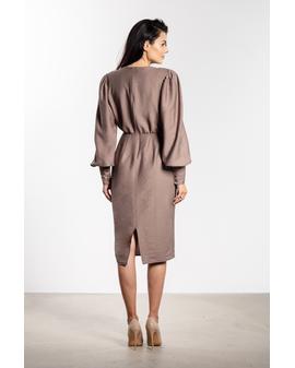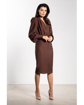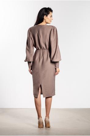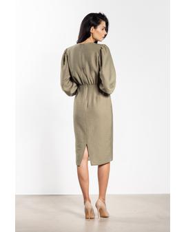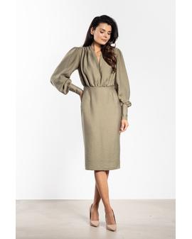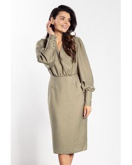 Sukienka midi o dopasowanym kroju to doskonały wybór na wyjątkowe okazje. Głęboki dekolt V eksponuje szyję i subtelnie podkreśla biust, nadając stylizacji kobiecego charakteru. Marszczenie w talii wysmukla sylwetkę, a ołówkowy dół gwarantuje klasyczną linię. Długie bufiaste rękawy z szerokim mankietem dodają lekkości i elegancji, a długość za kolano łączy klasę z kobiecością.