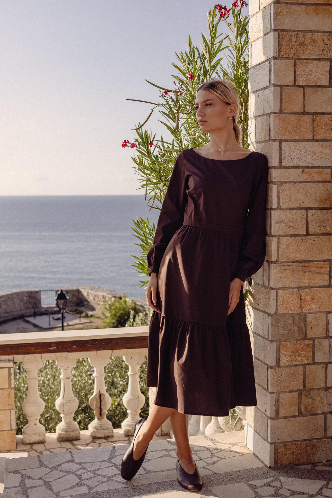 Stylowa sukienka midi o rozkloszowanym fasonie łączy elegancję z kobiecym wdziękiem. Dopasowana góra subtelnie podkreśla sylwetkę, a odcięcie w talii nadaje harmonijnych proporcji. Rozkloszowany dół z szeroką falbaną układa się lekko przy każdym ruchu, wprowadzając romantyczny akcent. Długie rękawy z mankietami i guzikiem dodają elegancji, a długość za kolano sprawia, że sukienka sprawdzi się zarówno na co dzień, jak i na oficjalne okazje.