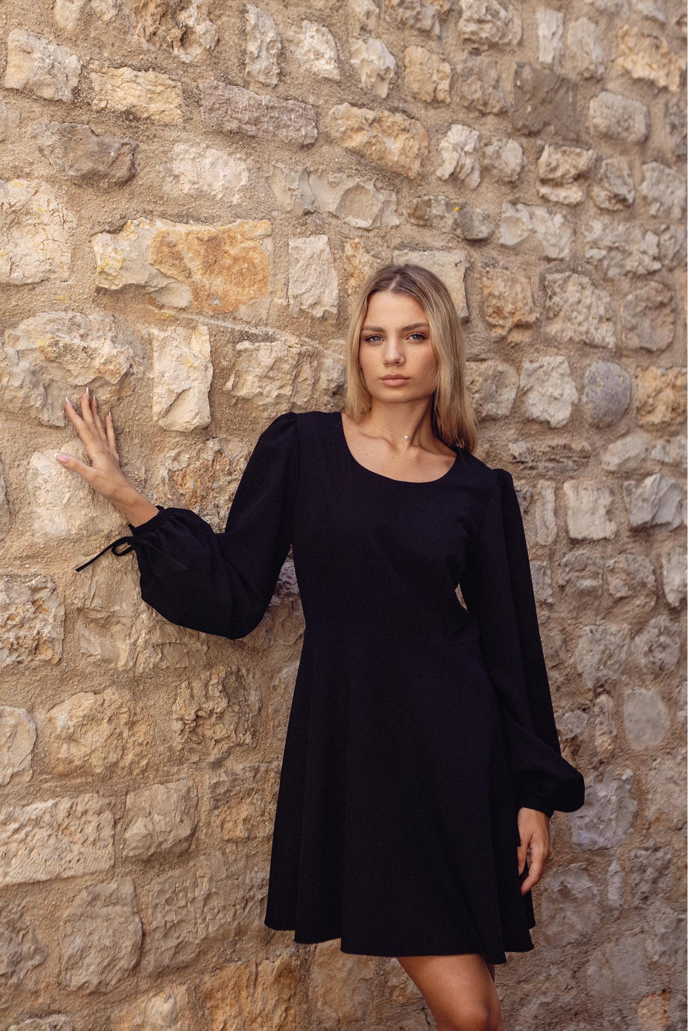 Sukienka mini o rozkloszowanym kroju łączy elegancję z lekkością. Półokrągły dekolt subtelnie podkreśla szyję i ramiona, a ozdobne wiązanie nadaje całości oryginalnego charakteru. Długie bufiaste rękawy zakończone mankietem z gumką dodają lekkości i kobiecego uroku. Rozkloszowany dół miękko układa się w ruchu, zapewniając swobodę i elegancki efekt. Model sprawdzi się zarówno na spotkania towarzyskie, jak i eleganckie okazje.