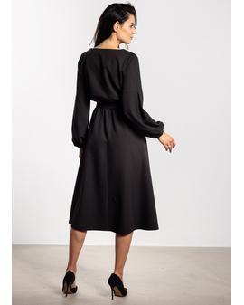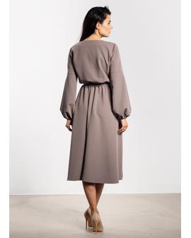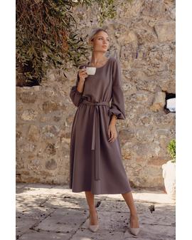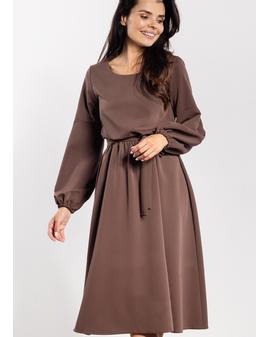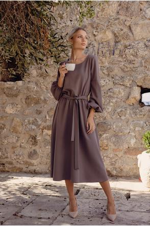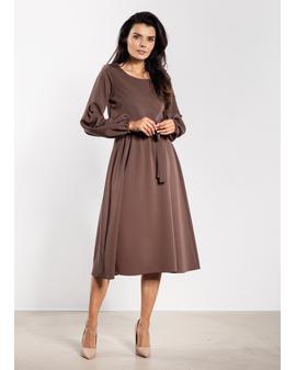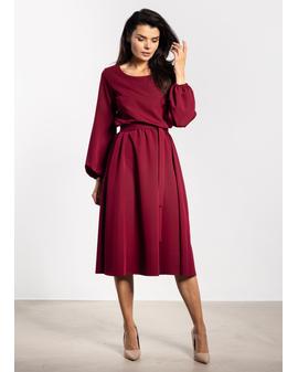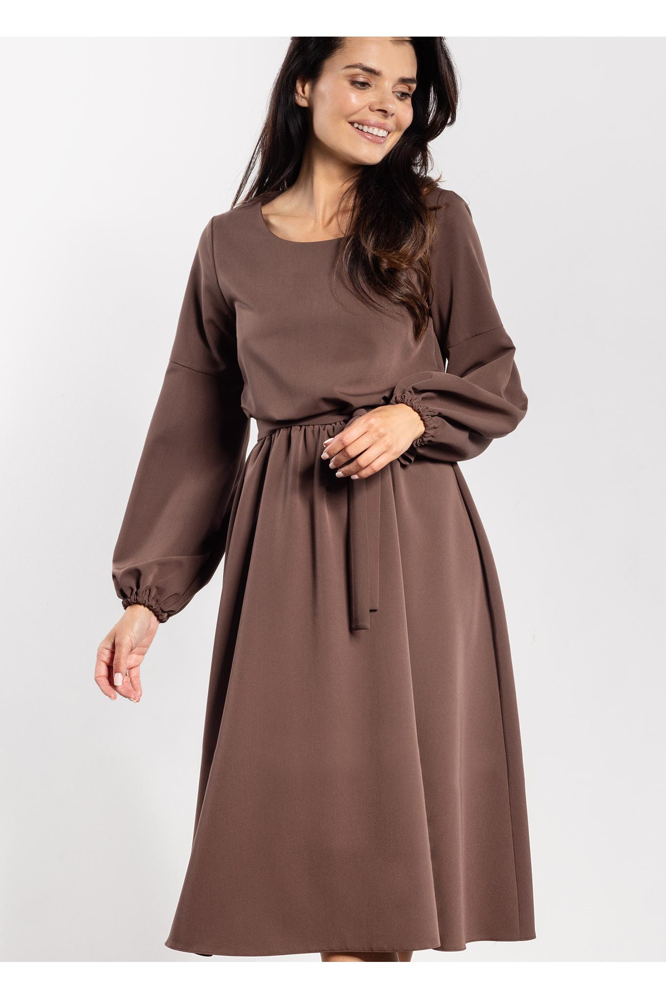 Sukienka midi o luźnym kroju łączy wygodę z elegancją. Gumka w talii dopasowuje się do sylwetki, a dołączony pasek dodatkowo podkreśla kobiece kształty. Długie bufiaste rękawy zakończone delikatnym marszczeniem nadają lekkości, a prosty okrągły dekolt sprawia, że model pozostaje uniwersalny i szykowny. Lekko rozkloszowany dół i długość za kolano dodają stylizacji klasy i swobody, czyniąc sukienkę odpowiednią zarówno na co dzień, jak i na eleganckie okazje.