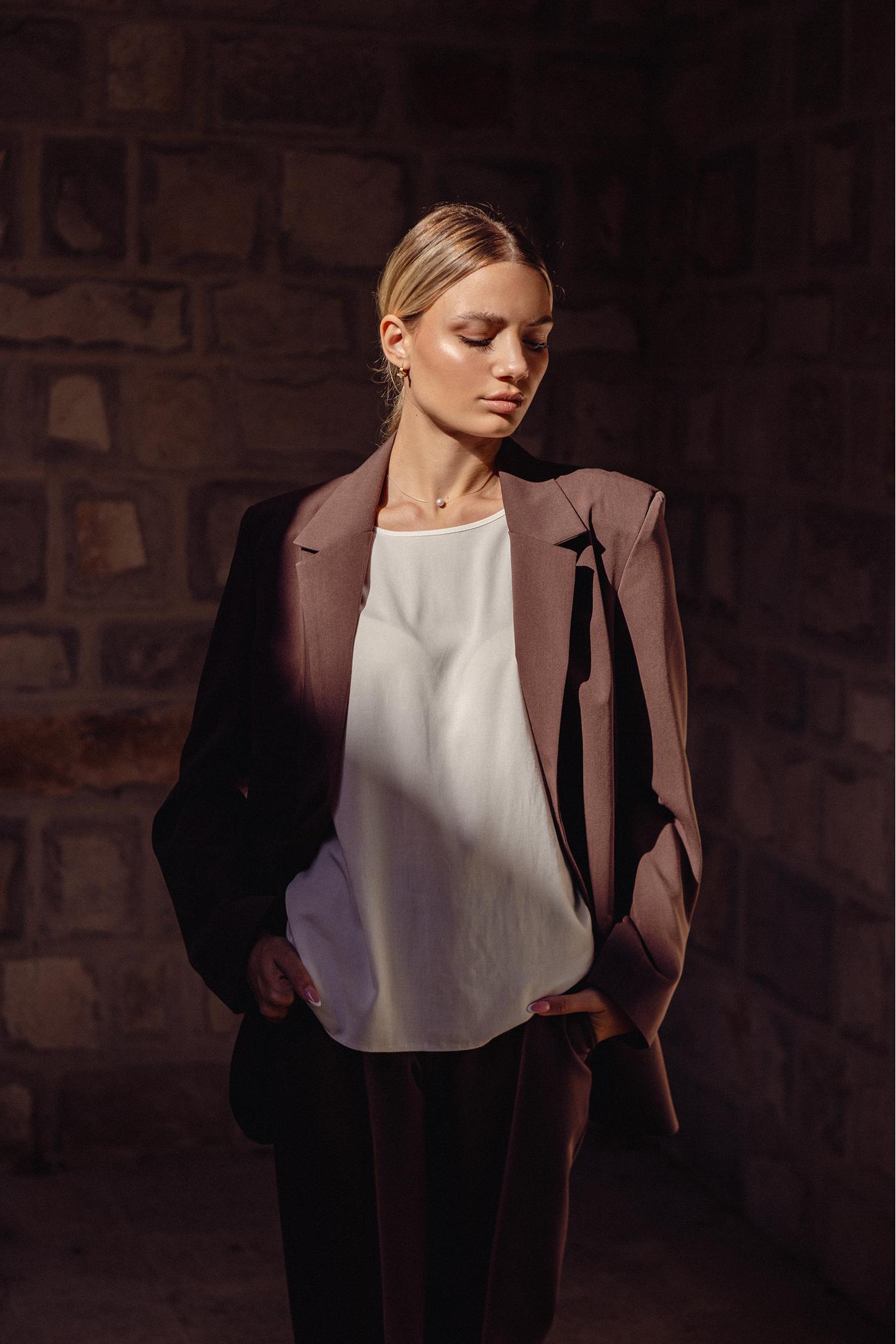 Klasyczna marynarka damska o ponadczasowym kroju łączy elegancję i wygodę. Luźny fason i prosta linia subtelnie podkreślają sylwetkę, a jednorzędowe zapięcie na guzik nadaje minimalistyczny, profesjonalny charakter. Klasyczne klapy i praktyczne kieszenie z patką dodają stylu i funkcjonalności. Uniwersalny model doskonale sprawdzi się w zestawieniu ze spodniami, ołówkową spódnicą czy sukienką, tworząc eleganckie stylizacje do pracy, na spotkania biznesowe lub formalne wyjścia.