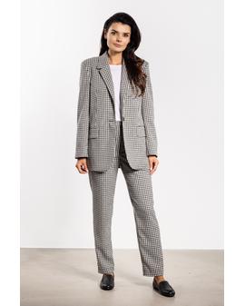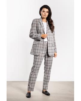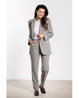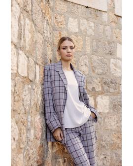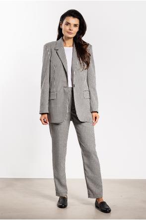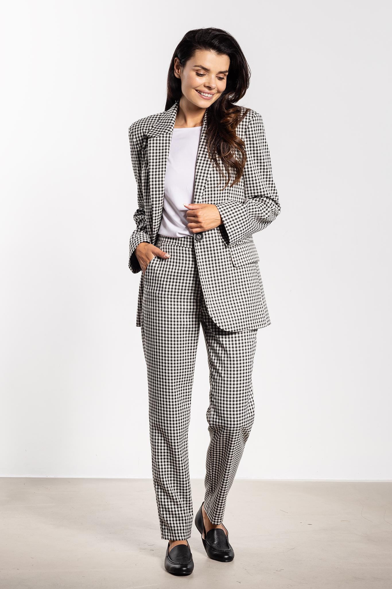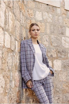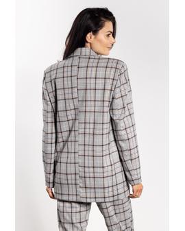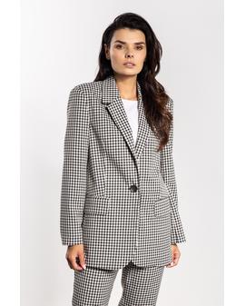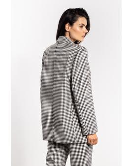 Elegancka marynarka damska w kratę o luźnym fasonie oversize łączy komfort i ponadczasowy styl. Klasyczny kołnierz z klapami i zapięcie na guzik podkreślają formalny charakter, a luźny krój zapewnia swobodę ruchów. Model doskonale komponuje się z eleganckimi spodniami, spódnicą lub casualowymi jeansami, sprawdzając się w pracy, na spotkaniach biznesowych oraz podczas codziennych stylizacji. Praktyczne kieszenie z klapką dodają funkcjonalności i nowoczesnego akcentu.