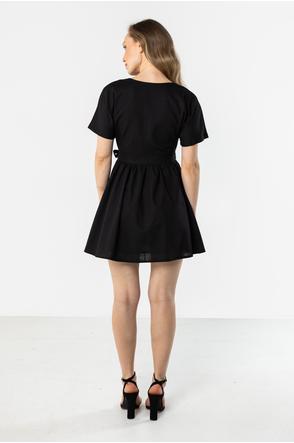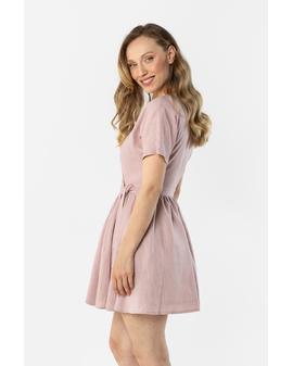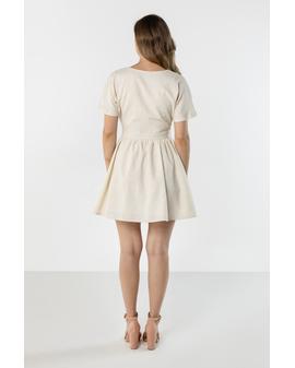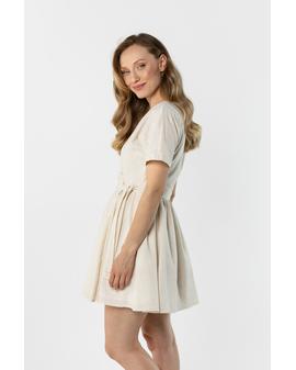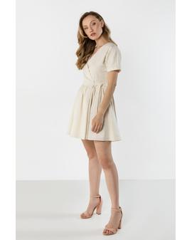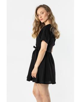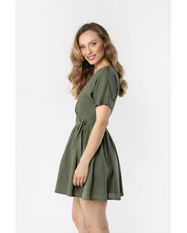 This lightweight wrap mini dress is perfect for warm days. The V-neck subtly accentuates the neck and adds a feminine touch, while the tie at the waist beautifully shapes the figure. Short sleeves ensure comfort, while the flared hem adds a light and airy feel. The natural linen fabric makes this dress perfect for everyday wear and summer events.