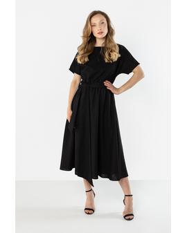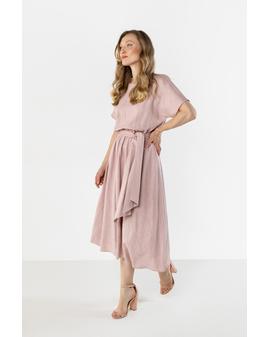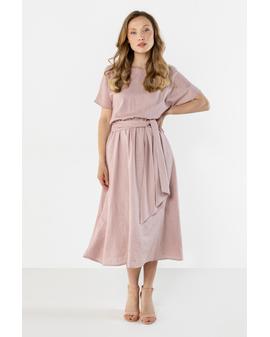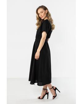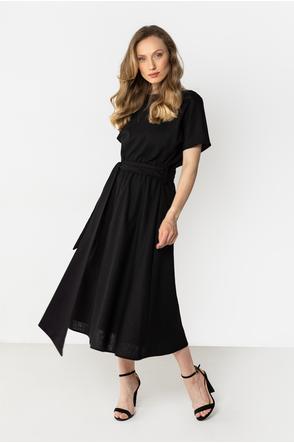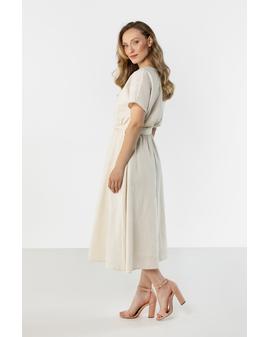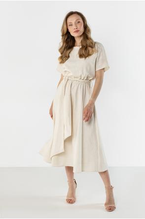 This lightweight midi dress with a feminine, relaxed fit is perfect for warm days. The straight neckline subtly accentuates the neckline, and short sleeves ensure comfortable wear. The tie at the waist beautifully shapes the figure and adds an elegant touch, while the flared hem flows smoothly with movement. The natural linen fabric makes the dress airy and perfect for both everyday wear and summer events.
