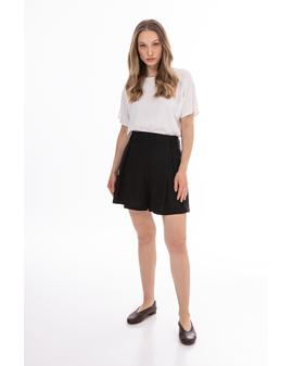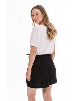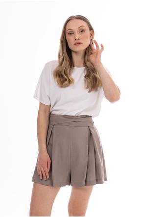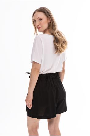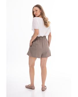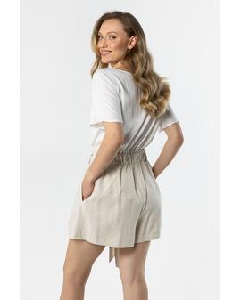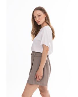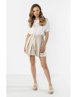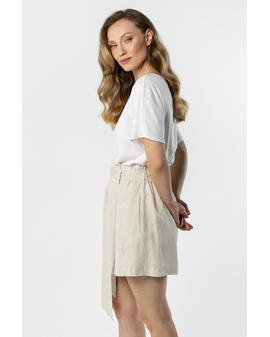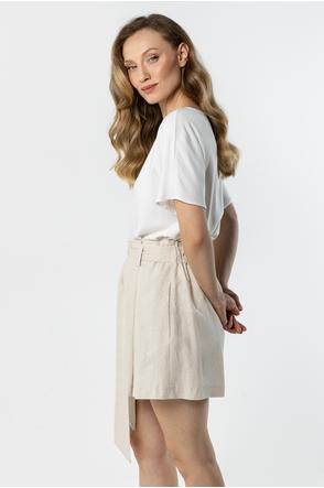 Lightweight and stylish linen shorts with a feminine, relaxed fit. The high waist with a decorative tie belt beautifully accentuates the waist, while subtle pleats at the front add an elegant touch. Loose legs provide comfort and a flattering fit.