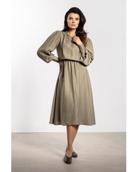 Elegancka sukienka midi o swobodnym kroju łączy wygodę z kobiecym stylem. Luźniejsza góra harmonijnie współgra z elastycznym pasem, który podkreśla talię i sylwetkę. Długie rękawy z szerokimi mankietami i guzikami dodają elegancji, a zaokrąglony dekolt zapewnia ponadczasowy wygląd. Długość za kolano sprawia, że sukienka nadaje się zarówno na co dzień, jak i na bardziej formalne okazje, zachowując klasyczny i szykowny charakter.
