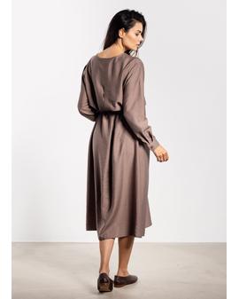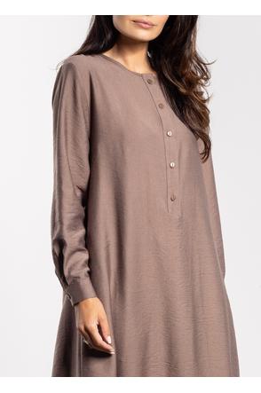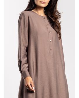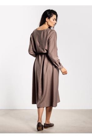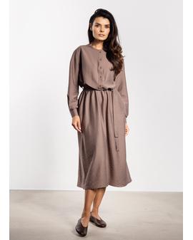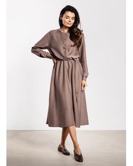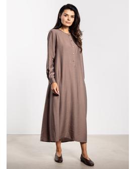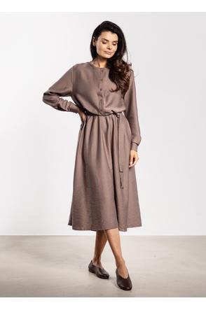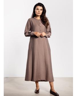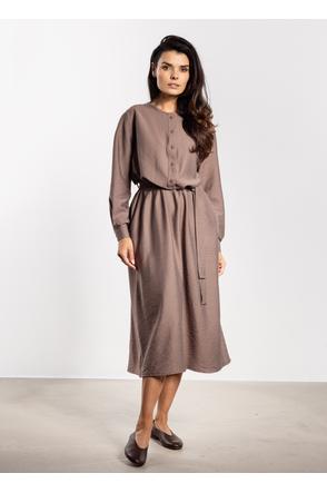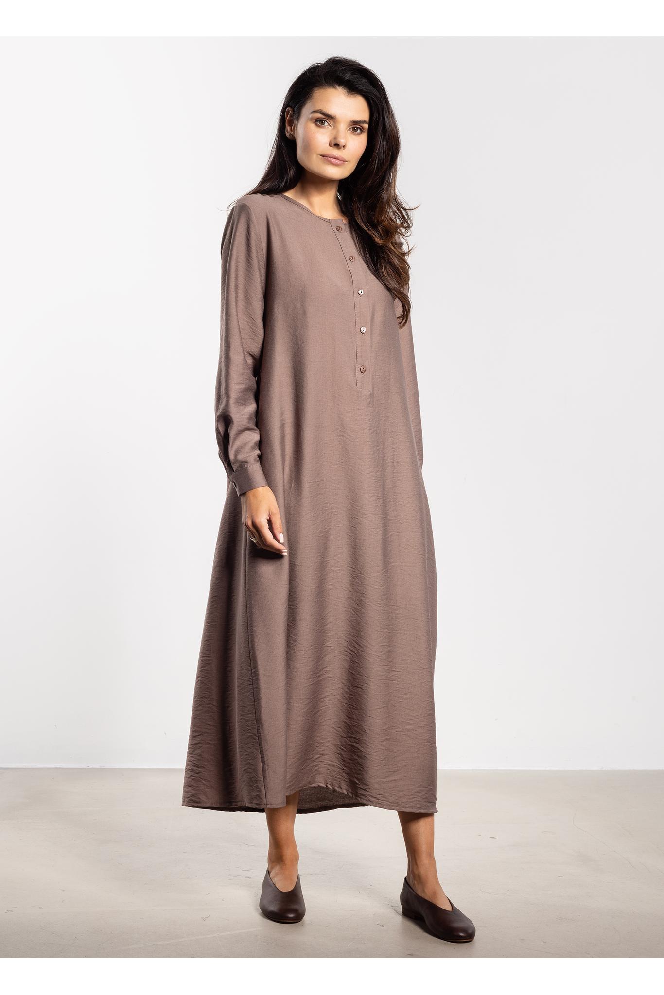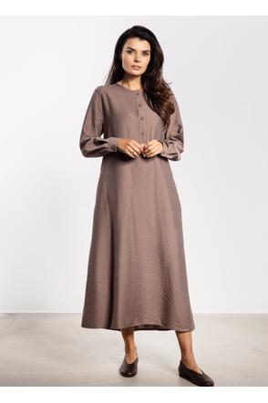 Sukienka maxi o prostym kroju A łączy elegancję z wygodą na co dzień. Długość do kostek subtelnie wydłuża sylwetkę, a minimalistyczny fason prezentuje się nowocześnie. Z przodu znajduje się rząd drobnych guzików, które dodają lekkości. Pasek z tego samego materiału pozwala nosić sukienkę luźno lub podkreślić talię, eksponując kobiece proporcje. Długie rękawy z mankietami zapewniają komfort i ponadczasowy charakter, dzięki czemu model sprawdzi się zarówno w codziennych, jak i eleganckich stylizacjach.
