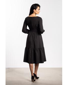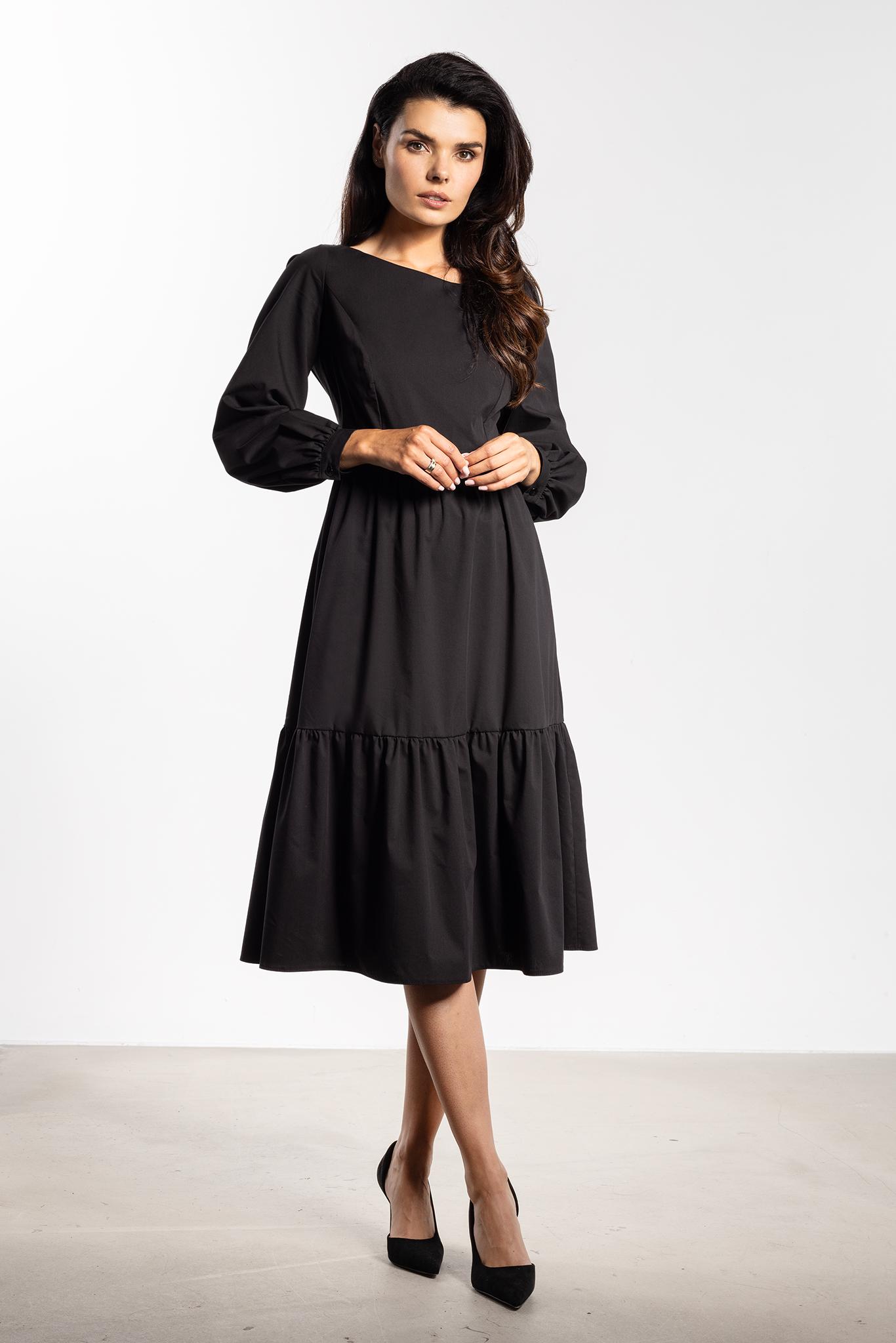 Stylowa sukienka midi o rozkloszowanym fasonie łączy elegancję z kobiecym wdziękiem. Dopasowana góra subtelnie podkreśla sylwetkę, a odcięcie w talii nadaje harmonijnych proporcji. Rozkloszowany dół z szeroką falbaną układa się lekko przy każdym ruchu, wprowadzając romantyczny akcent. Długie rękawy z mankietami i guzikiem dodają elegancji, a długość za kolano sprawia, że sukienka sprawdzi się zarówno na co dzień, jak i na oficjalne okazje.