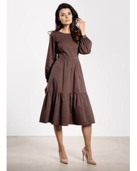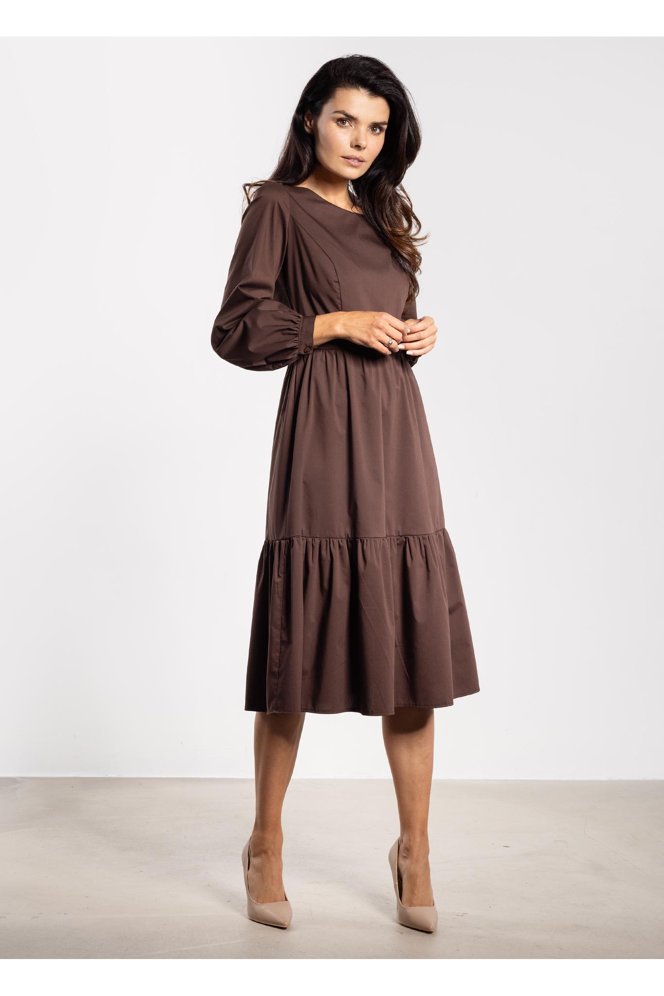 Stylowa sukienka midi o rozkloszowanym fasonie łączy elegancję z kobiecym wdziękiem. Dopasowana góra subtelnie podkreśla sylwetkę, a odcięcie w talii nadaje harmonijnych proporcji. Rozkloszowany dół z szeroką falbaną układa się lekko przy każdym ruchu, wprowadzając romantyczny akcent. Długie rękawy z mankietami i guzikiem dodają elegancji, a długość za kolano sprawia, że sukienka sprawdzi się zarówno na co dzień, jak i na oficjalne okazje.