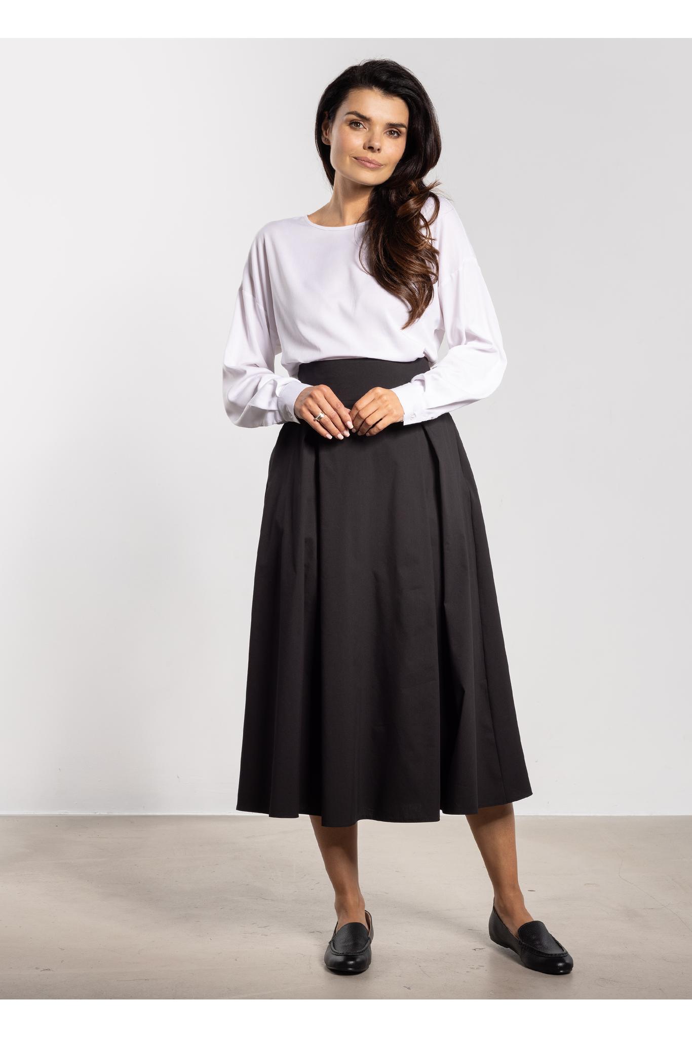 Klasyczna spódnica midi z wysokim stanem pięknie podkreśla talię i optycznie wydłuża sylwetkę. Szeroki pas z wiązaniem z tyłu dodaje kobiecego charakteru, a rozkloszowany dół układa się lekko i swobodnie, zapewniając komfort noszenia. Długość za kolano sprawia, że spódnica jest uniwersalna – świetnie sprawdzi się zarówno w codziennych stylizacjach, jak i eleganckich zestawieniach. Minimalistyczny fason daje wiele możliwości kombinacji – od klasycznych koszul po luźne swetry i topy.