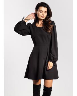 Sukienka mini o rozkloszowanym kroju łączy elegancję z lekkością. Półokrągły dekolt subtelnie podkreśla szyję i ramiona, a ozdobne wiązanie nadaje całości oryginalnego charakteru. Długie bufiaste rękawy zakończone mankietem z gumką dodają lekkości i kobiecego uroku. Rozkloszowany dół miękko układa się w ruchu, zapewniając swobodę i elegancki efekt. Model sprawdzi się zarówno na spotkania towarzyskie, jak i eleganckie okazje.