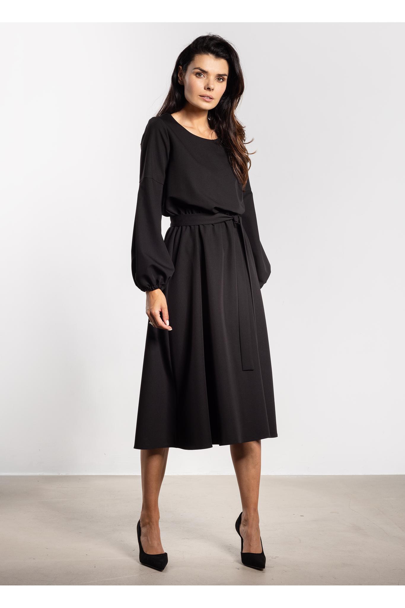 Sukienka midi z paskiem i gumką w talii – elegancki luźny fason