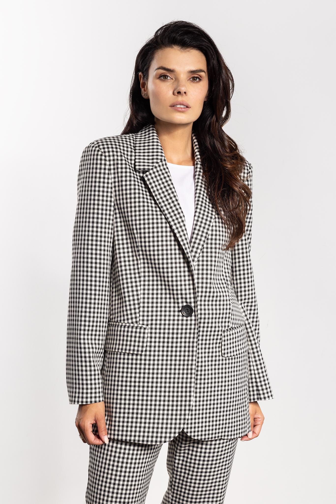 Elegancka marynarka damska w kratę o luźnym fasonie oversize łączy komfort i ponadczasowy styl. Klasyczny kołnierz z klapami i zapięcie na guzik podkreślają formalny charakter, a luźny krój zapewnia swobodę ruchów. Model doskonale komponuje się z eleganckimi spodniami, spódnicą lub casualowymi jeansami, sprawdzając się w pracy, na spotkaniach biznesowych oraz podczas codziennych stylizacji. Praktyczne kieszenie z klapką dodają funkcjonalności i nowoczesnego akcentu.