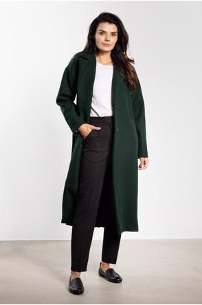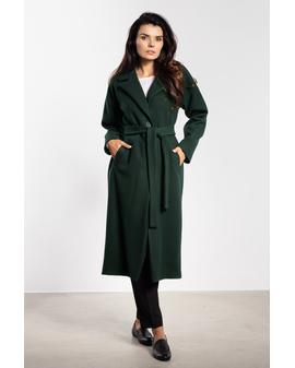 Długi płaszcz damski o prostym kroju z paskiem – elegancki i minimalistyczny