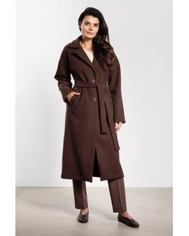 Długi płaszcz damski o prostym kroju z paskiem – elegancki i minimalistyczny