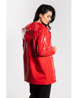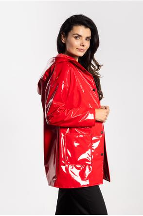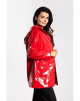 Lateksowa kurtka damska z kapturem i kieszeniami – modny fason