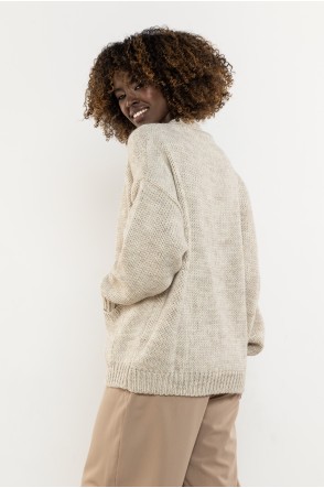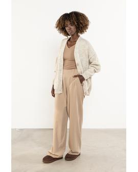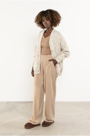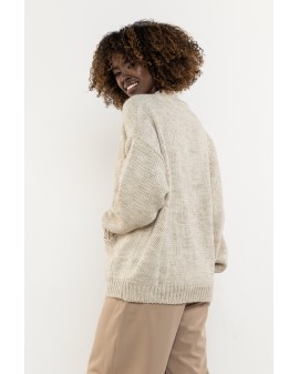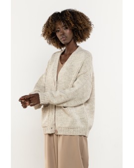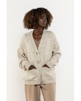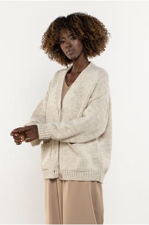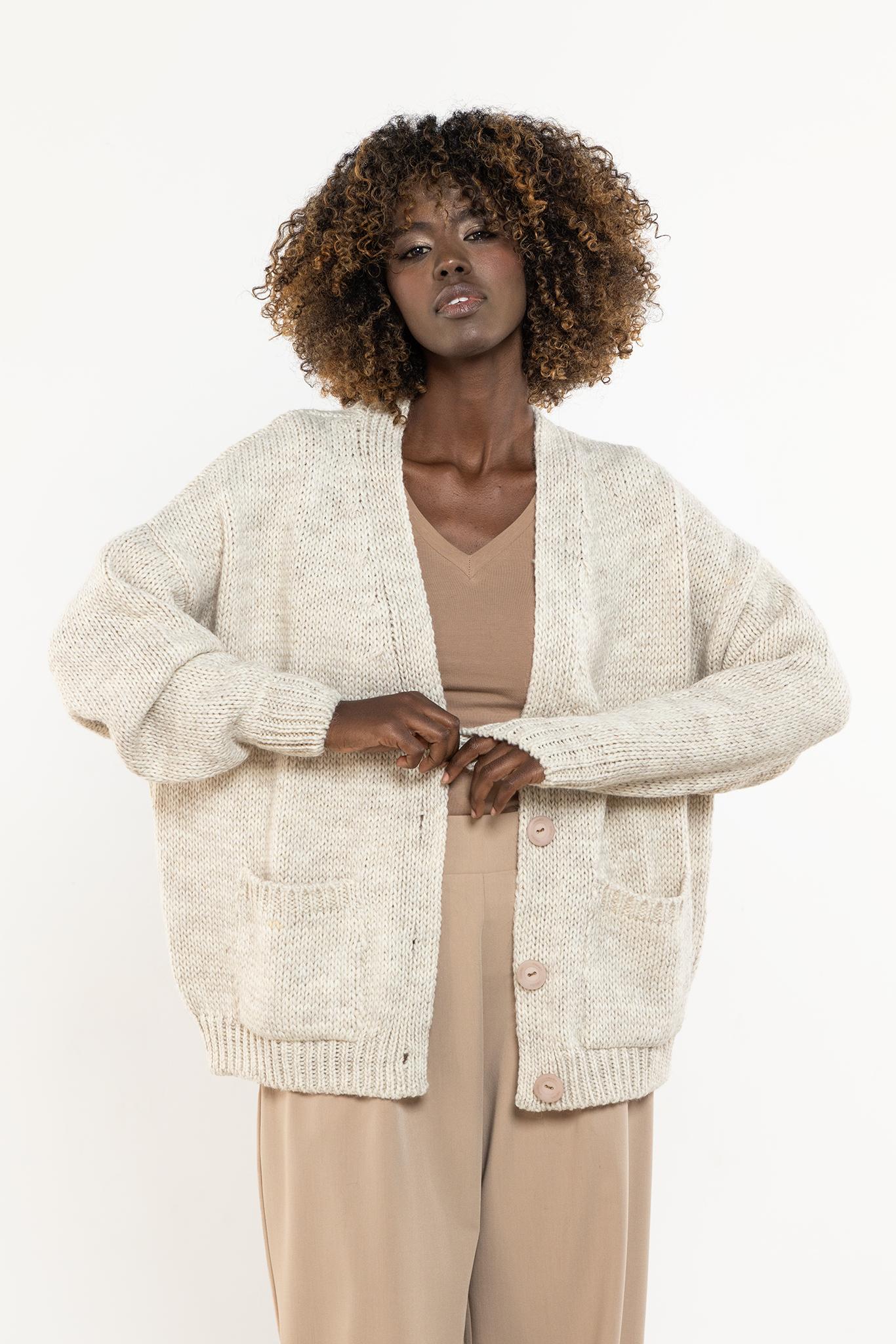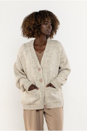 Propozycja dla kobiet ceniących prostotę, miękkość i funkcjonalność. Uszyty w Polsce z dbałością o detale. Basicowy krój z dekoltem V, zapięciem na guziki i kieszeniami płynnie przechodzi między casualem a smart casualem. Miękka dzianina z dodatkiem wełny otula i grzeje w sezonie jesień–zima.