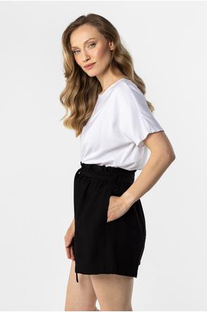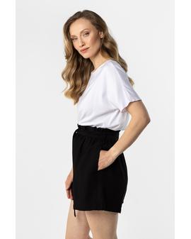 Lekkie szorty o swobodnym kroju to idealny wybór na ciepłe dni. Wysoki stan z marszczoną talią pięknie podkreśla sylwetkę, a wiązanie w pasie dodaje całości kobiecego charakteru. Luźniejsze nogawki zapewniają wygodę i swobodę ruchów, a praktyczne kieszenie zwiększają komfort noszenia. Model świetnie sprawdzi się w codziennych, letnich stylizacjach.