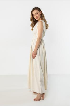 Lekka i elegancka lniana sukienka maxi o kobiecym, ponadczasowym kroju. Kopertowy dekolt w kształcie litery V pięknie podkreśla szyję i dekolt, a odcięcie w talii subtelnie modeluje sylwetkę. Rozkloszowany dół swobodnie układa się w ruchu, dodając całości lekkości.