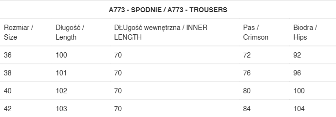 Wymiary w tabelce to wymiary gotowego produktu mierzonego na płasko.